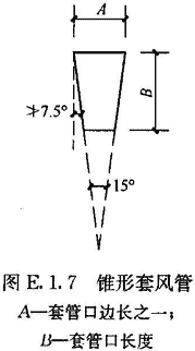 E.1.7 選用套管法時,可用輕質(zhì)板材或膜材做成與風(fēng)口內(nèi)截面相同或相近、長度大于2倍風(fēng)口邊長的直管段作為輔助風(fēng)管,連接于過濾器風(fēng)口外部,在套管出口平面上,均勻劃分小方格,方格邊長不大于200mm,在方格中心設(shè)測點(diǎn)。對于小風(fēng)口,最少測點(diǎn)數(shù)不少于6點(diǎn)。也可采用錐形套管,上口與風(fēng)口內(nèi)截面相同或相近,下口面積不小于上口面積的一半,長度宜大于1.5倍風(fēng)口邊長,側(cè)壁與垂直面的傾斜角不宜大于7.5°,以測定截面平均風(fēng)速,乘以測定截面凈面積算出風(fēng)量(圖E.1.7)。