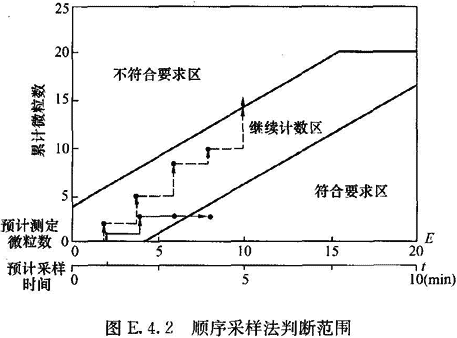 13 對于需要很大采樣量、耗時很大的某粒徑微粒的檢測,可采用順序采樣法,即將每次測定結(jié)果標(biāo)注于圖E.4.2上,當(dāng)標(biāo)注點(diǎn)落入不合格區(qū)時,即停止檢測,結(jié)果為不達(dá)標(biāo);當(dāng)標(biāo)注點(diǎn)落入合格區(qū)時,停止檢測,結(jié)果為達(dá)標(biāo);當(dāng)標(biāo)注點(diǎn)一直在繼續(xù)區(qū)中延伸,而總采樣量已達(dá)到表E.4.2—2的最小采樣量,累計(jì)微粒數(shù)仍小于20,即停止檢測,結(jié)果為達(dá)標(biāo);當(dāng)標(biāo)注點(diǎn)一直在繼續(xù)區(qū)中延伸,而總采樣量未達(dá)到最小采樣量,但累計(jì)微粒數(shù)已超過20,即停止檢測,結(jié)果為不達(dá)標(biāo)。
