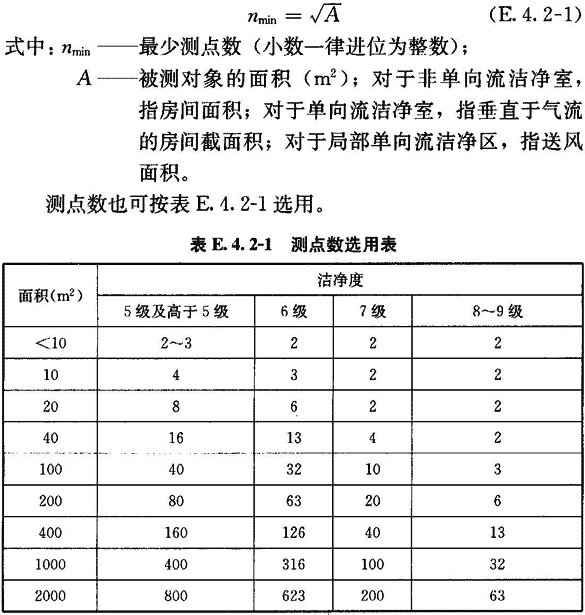 E.1.4 對于單向流潔凈室,可采用室截面平均風(fēng)速和截面積乘積的方法確定送風(fēng)量,垂直單向流潔凈室的測定截面取距地面0.8m的無阻隔面(孔板、格柵除外)的水平截面,如有阻隔面,該測定截面應(yīng)抬高至阻隔面之上0.25m;水平單向流潔凈室取距送風(fēng)面0.5m的垂直于地面的截面,截面上測點(diǎn)間距不應(yīng)大于1m,一般取0.3m。測點(diǎn)數(shù)應(yīng)不少于20個,均勻布置。