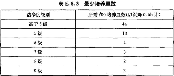 7 培養(yǎng)皿數(shù)應(yīng)不少于微粒計(jì)數(shù)濃度的測點(diǎn)數(shù),如工藝無特殊要求應(yīng)大于等于表E.8.3中的最少培養(yǎng)皿數(shù),另外各加1個對照皿。