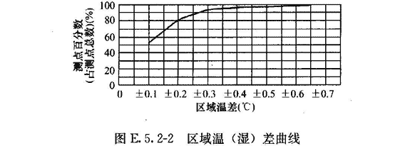 區(qū)域溫差、區(qū)域相對濕度差:按測點(diǎn)中最低或最高的一次測定值與各測點(diǎn)平均溫度和平均相對濕度的差值的測點(diǎn)數(shù),占測點(diǎn)總數(shù)的百分比,整理成累計(jì)統(tǒng)計(jì)曲線(圖E.5.2—2)。