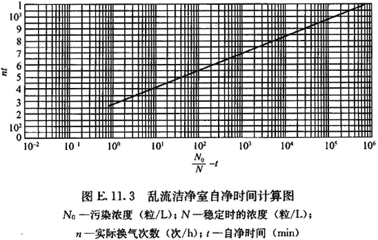 E.11.3 由測得的開機(jī)前原始濃度或發(fā)煙停止后1min的污染濃度(N0)、室內(nèi)達(dá)到穩(wěn)定時的濃度(N)和實(shí)際換氣次數(shù)(n)查圖E.11.3,得到計(jì)算自凈時間,再和實(shí)測自凈時間進(jìn)行對比。